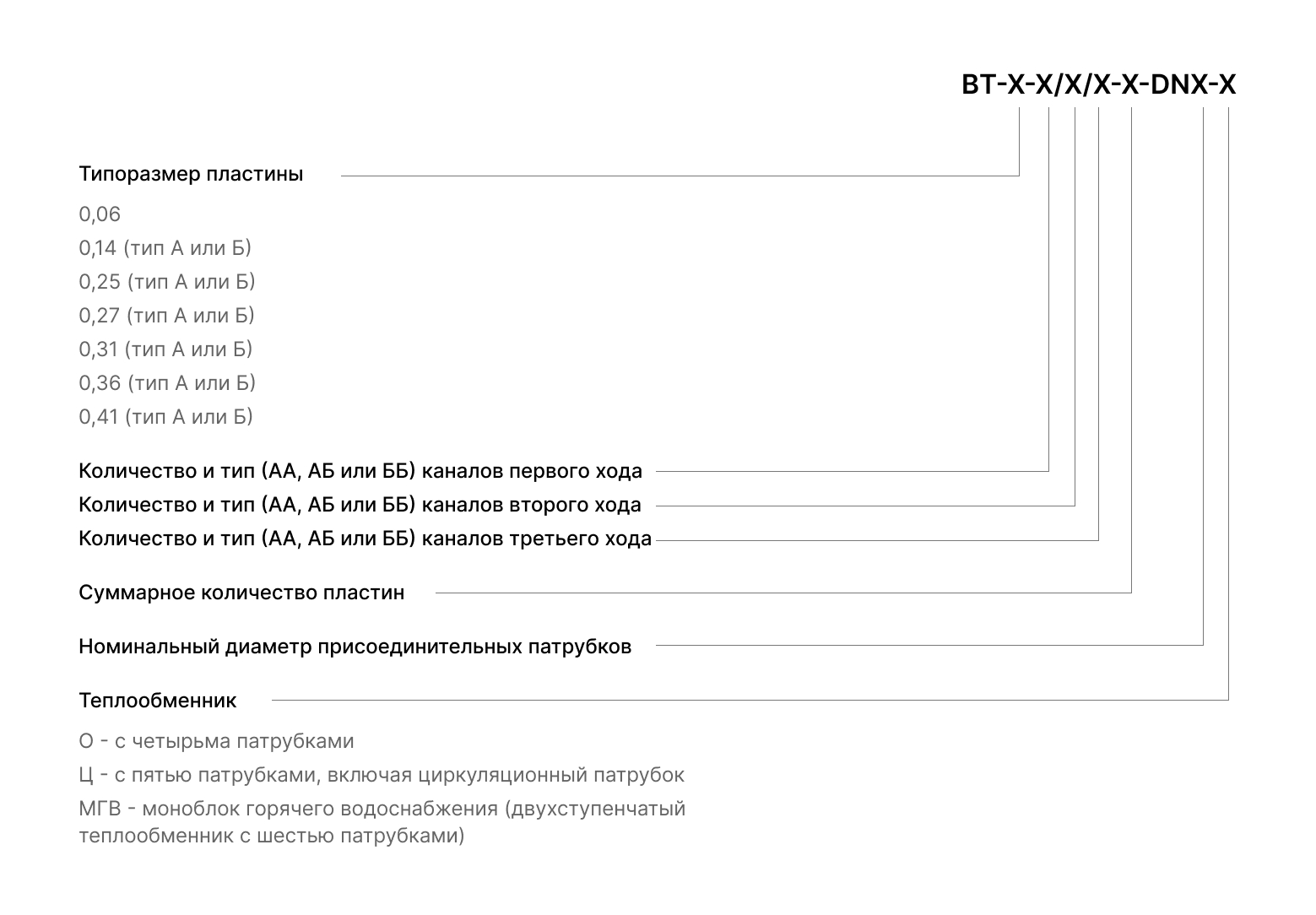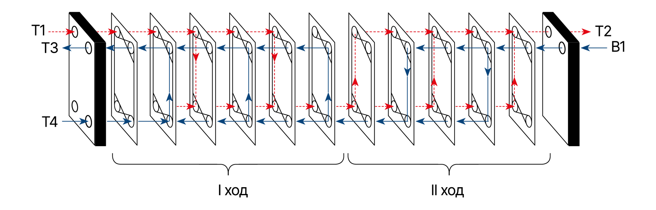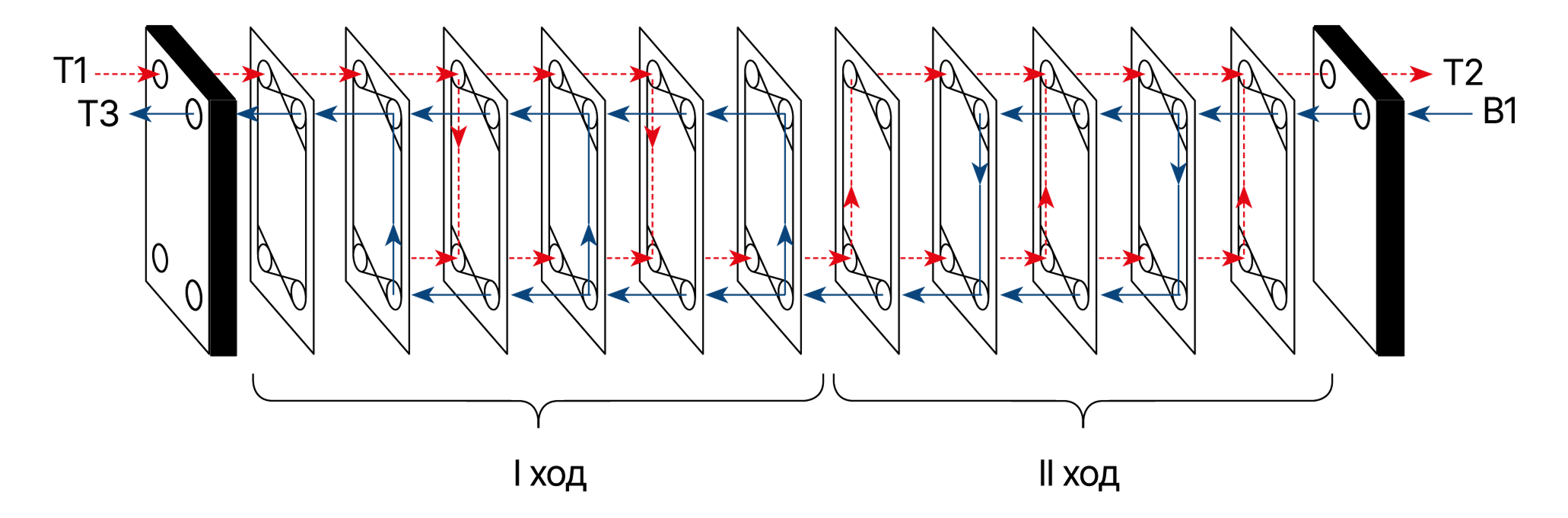 Теплообменник ВТ с типоразмером пластин 0,14; с количеством каналов 26 шт. типа ББ первого хода; количеством каналов 26 шт. типа ББ второго хода; суммарное количество пластин теплообменника 53 шт; номинальный диаметр патрубков – 50 мм; теплообменник с циркуляционным (Ц) патрубком.
